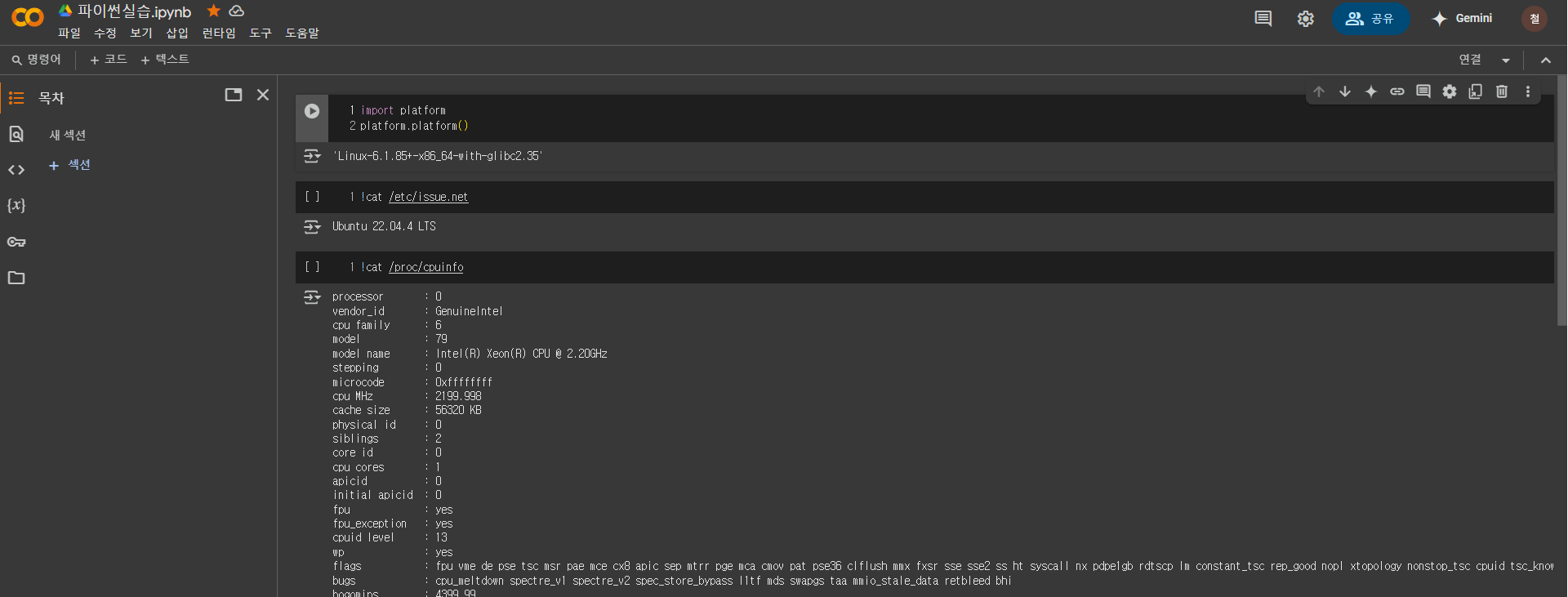 Colab이 실행되면 다음과 같은 화면이 나타납니다.